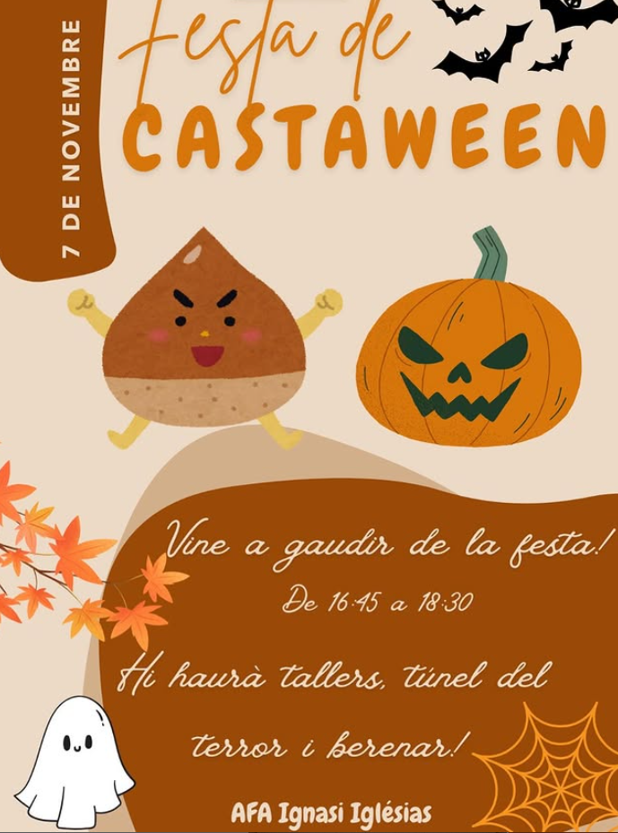 El proper divendres 7 de novembre celebrarem Castaween 🌰🎃 al pati de l’escola a partir de les 16:45h. Hi haurà berenar 🍊🍌, tallers molt divertits ✂️🎨 i un terrorífic túnel del terror 🧟 🕸️🕷️👻!!