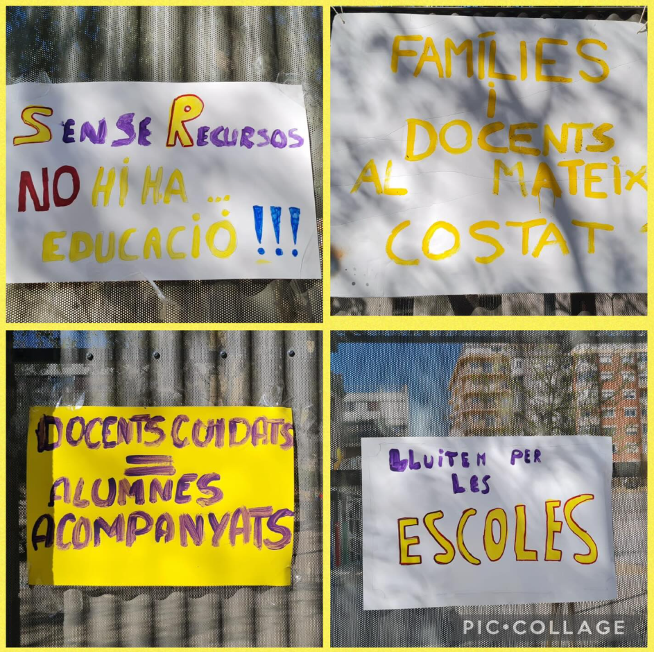 Divendres 20 vam sortir al carrer famílies, docents i alumnes per defensar l’educació pública. Aquestes pancartes les vam fer amb il·lusió, però també amb preocupació pel futur de l’escola.