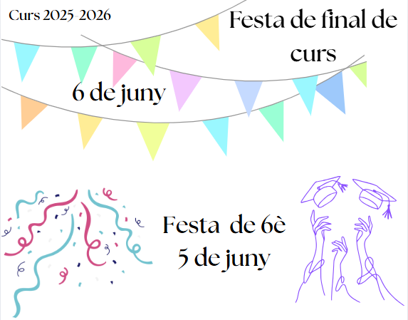 – Festa de final de curs: la traca final!!! Diem adéu al curs tal i com es mereix l’ocasió, un sopar al pati de l’escola on cada família porta el seu menjar. Música, espectacles, DJ,…qualsevol cosa pot passar en aquesta nit tan especial!
